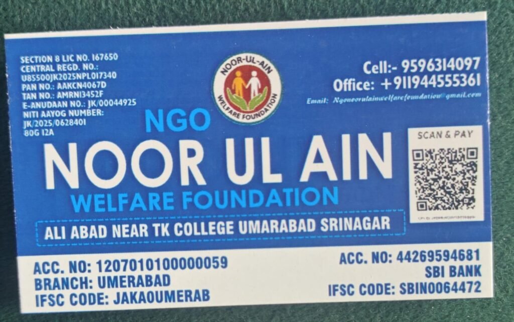 Together, we can bring light to countless hearts in need. Noor-ul-Ain Welfare Foundation connects kind-hearted donors, volunteers, and supporters to help families struggling with poverty, illness, and hunger.Your small contribution can provide education to a child, medical aid to the sick, food to the hungry, and hope to the hopeless.🌙 Let’s join hands to make this world a place where every life matters and every heart shines with hope